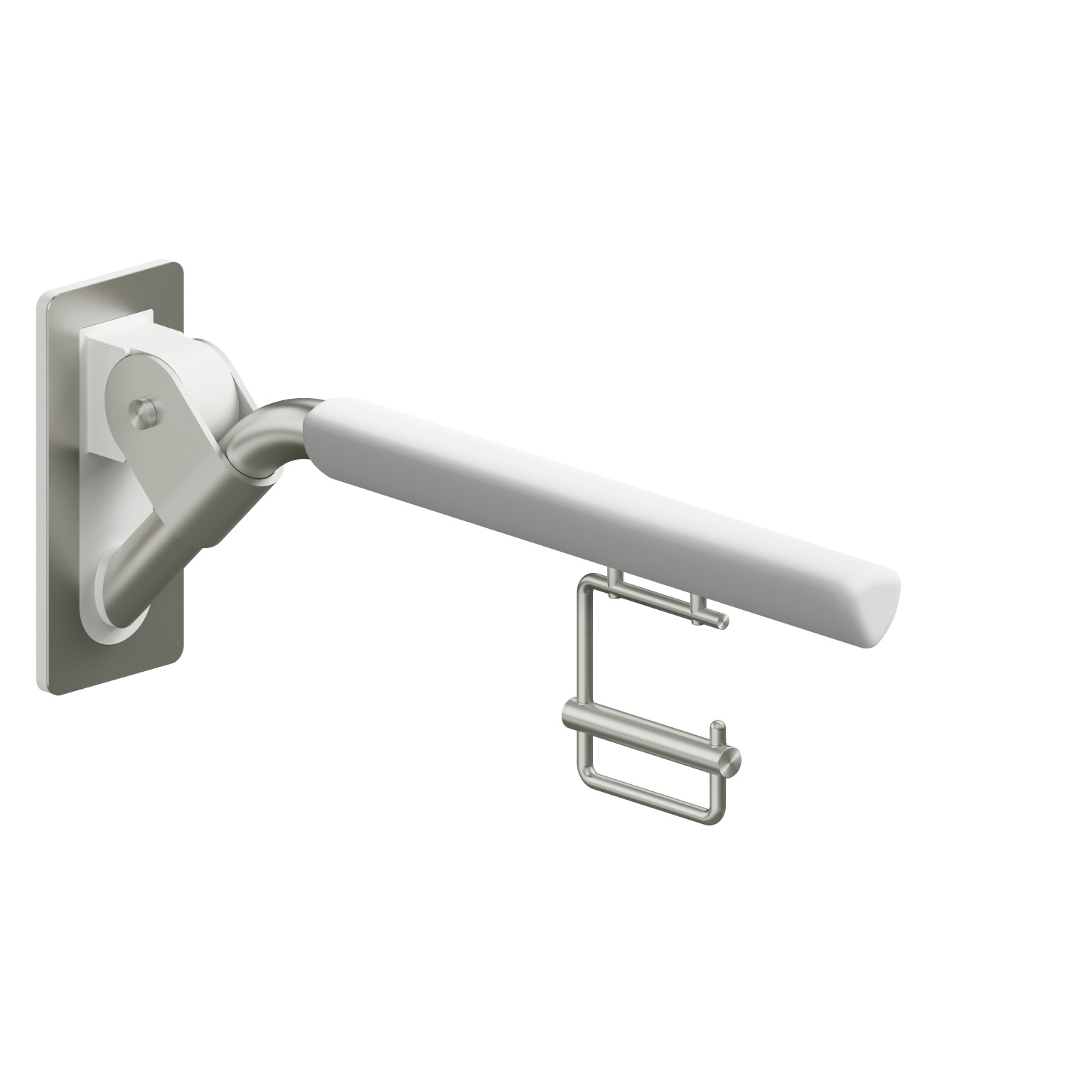 Dieser Klappgriff der Produktserie Evolution ist bequem gepolstert mit Papierrollenhalter in Griffweite. Also ist kein lästiges Drehen und Recken zur Wand nötig, um Toilettenpapier zu benutzen. Dagegen bietet der Griff mit Edelstahlkern und Polyurethan-Schäumung sicheren Halt und bequemes Abstützen beim Besuch des WCs. Der spezielle Querschnitt des Polsters sorgt für Komfort, aber auch sicheren Griff. Das ausgezeichnete Design mit matt gebürsteten Komponenten aus Edelstahl sowie Wandflansch und Polster in reinweiß oder anthrazit setzt einerseits zurückhaltende Akzente und passt sich andererseits jeder Raumgestaltung mühelos an.